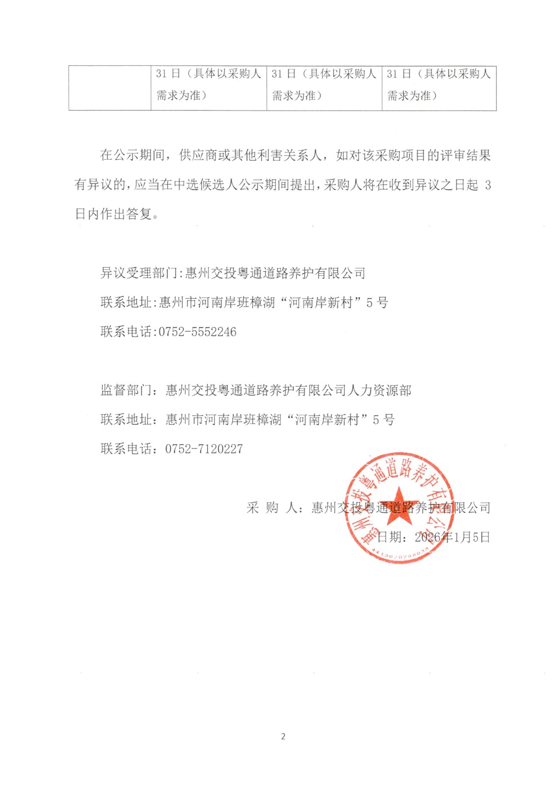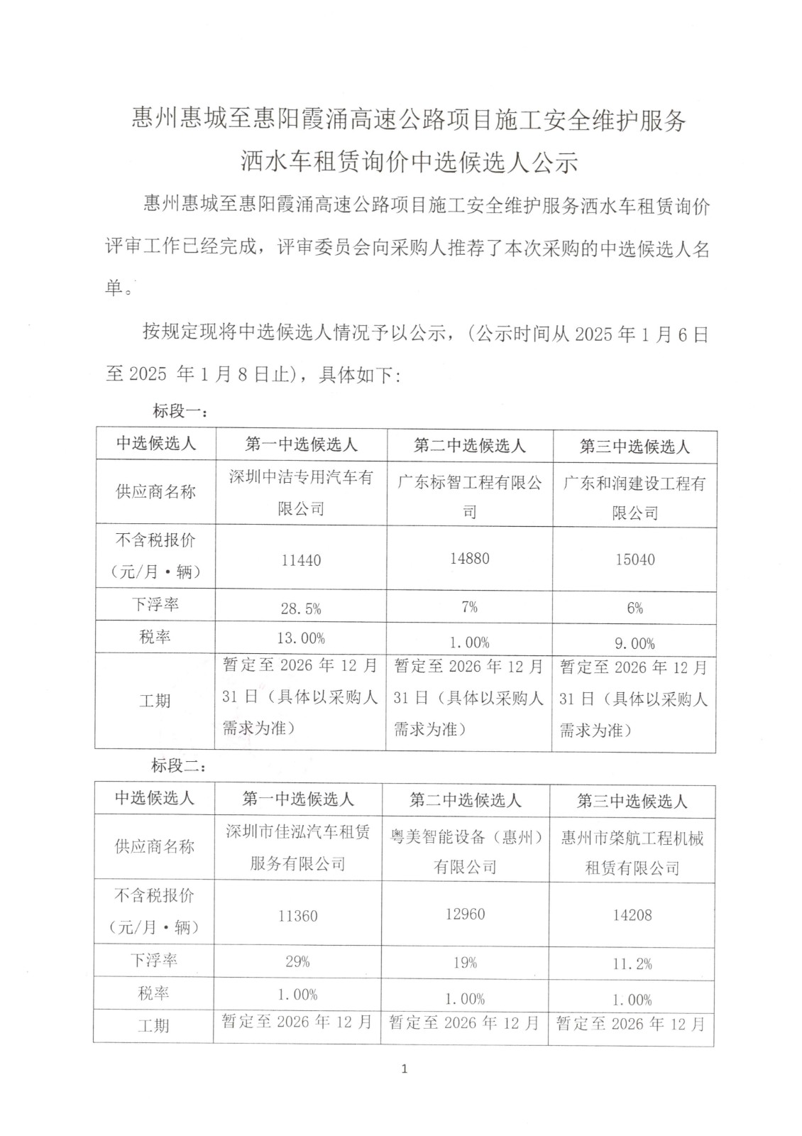 惠州惠城至惠阳霞涌高速公路项目施工安全维护服务洒水车租赁询价中选候选人公示