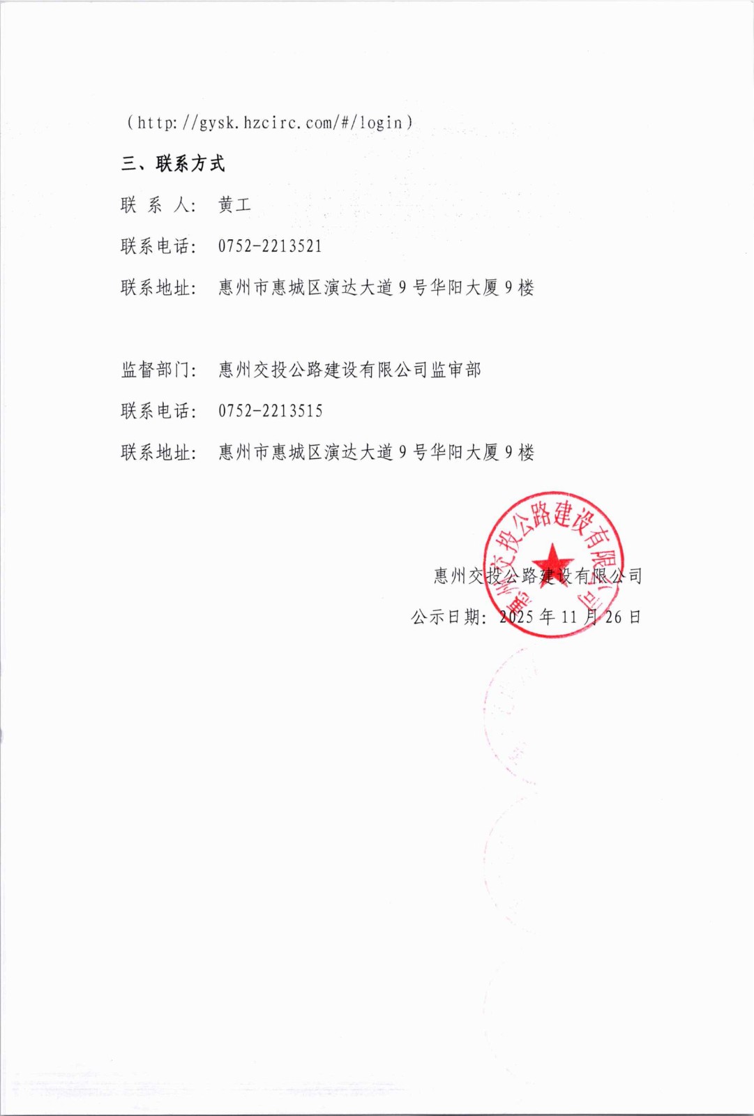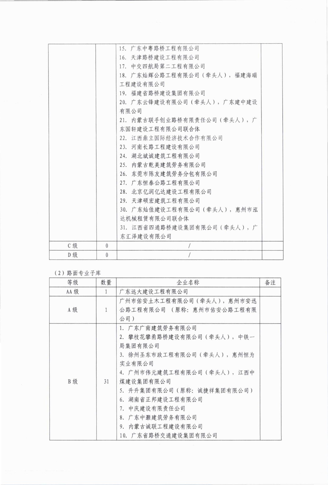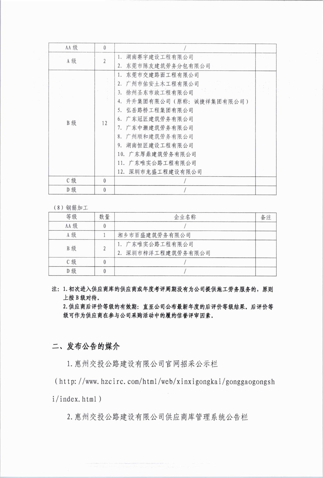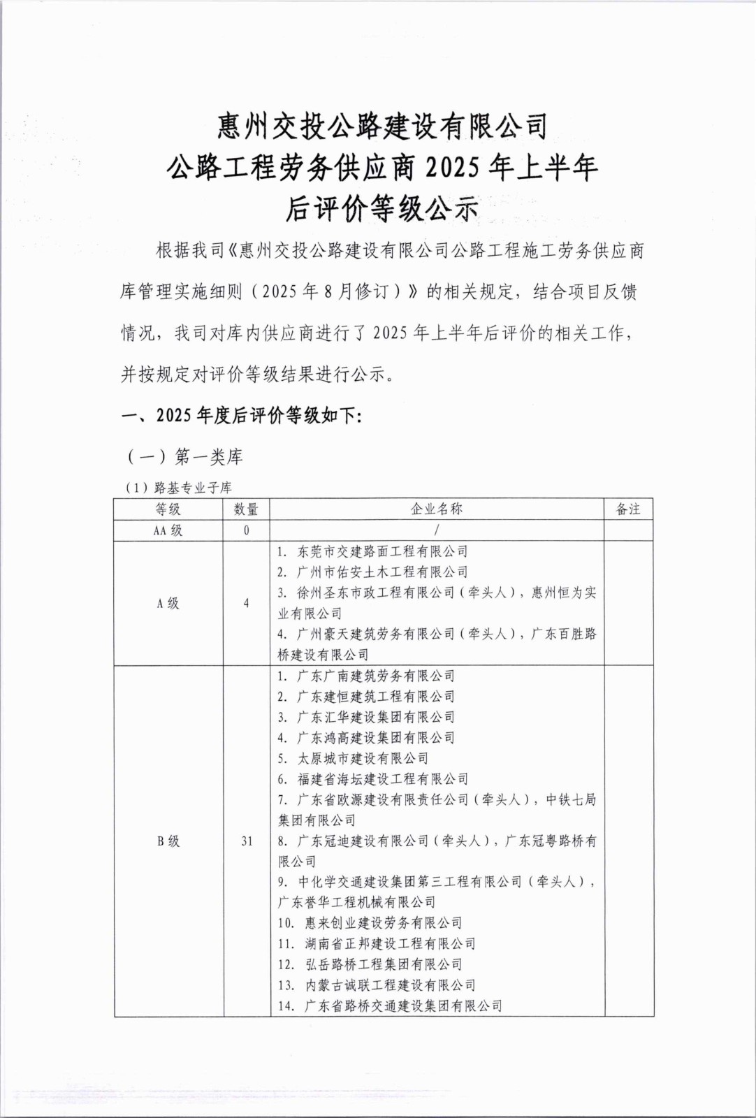 惠州交投公路建设有限公司公路工程劳务供应商2025年上半年后评价等级公示